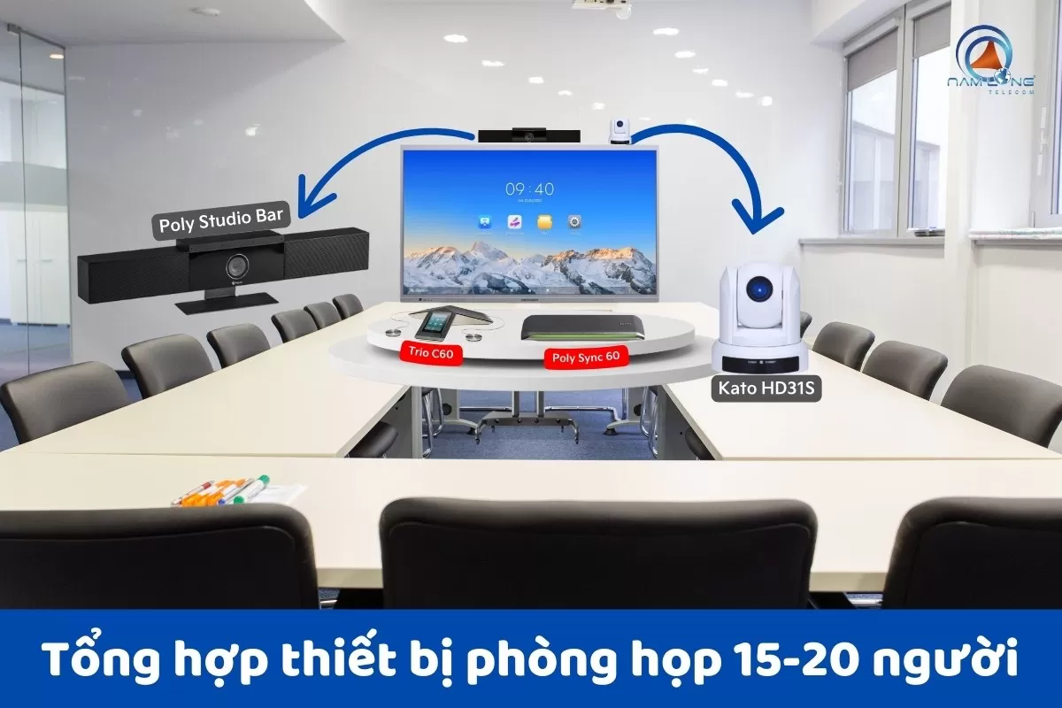 Để tổ chức cuộc họp trực tuyến hiệu quả cho 15–20 người, bạn có thể lựa chọn từ giải pháp all-in-one Poly Studio Bar, đến combo Poly Trio + Kato HD31S, hoặc bộ HP Poly Sync 60 + Kato HD31S. Ngoài ra, Logitech Group cũng là lựa chọn phổ biến nhờ giá thành hợp lý.